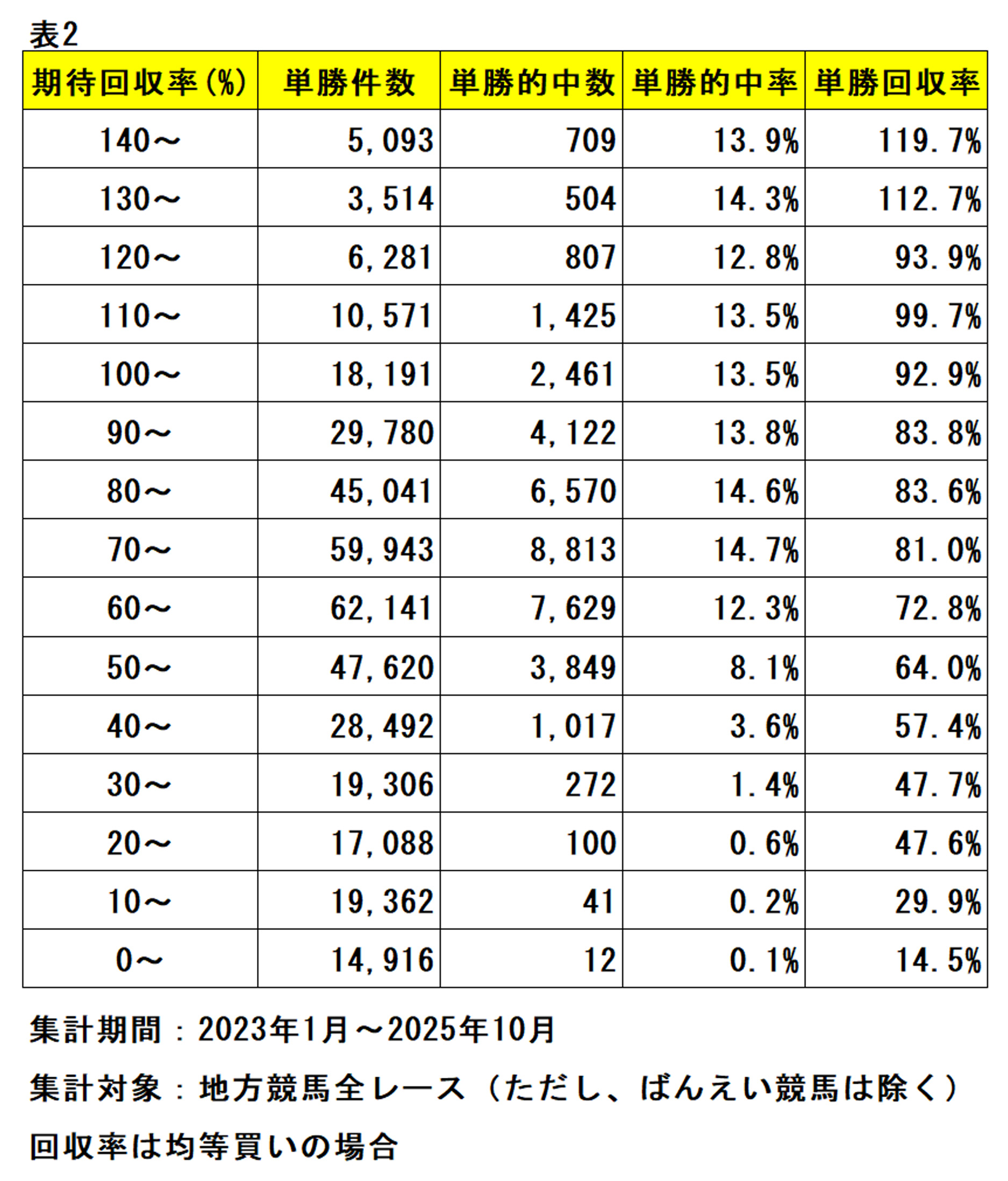 表2は、AIが算出した予測勝率と予測オッズを掛け合わせて求めた「期待回収率」を10%刻みで分類し、2023年1月~2025年10月の実際の単勝回収率と照らし合わせたものです。