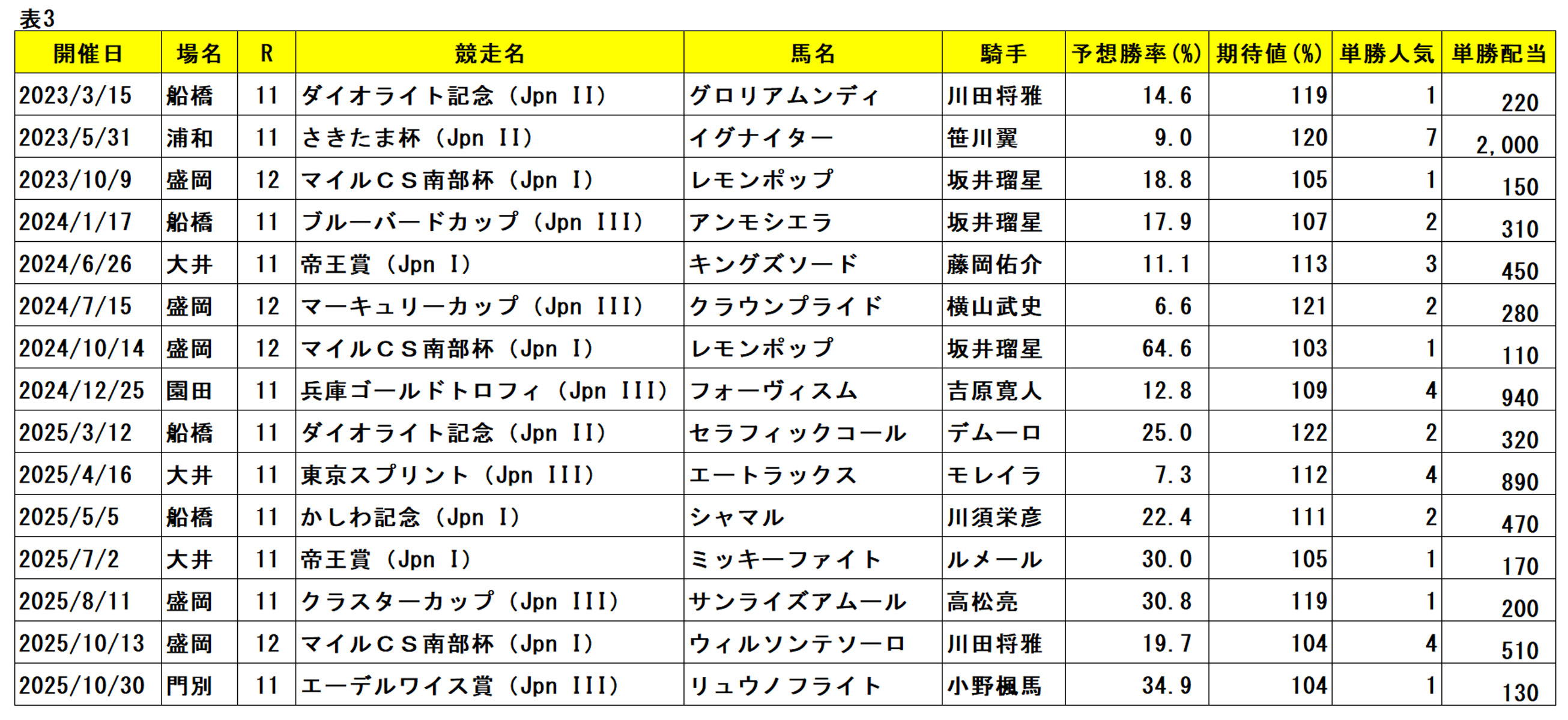 表3は、2023年1月~2025年10月に実施されたダートグレード競走で、Expected指数による期待回収率が100%以上だった馬の単勝的中例です。