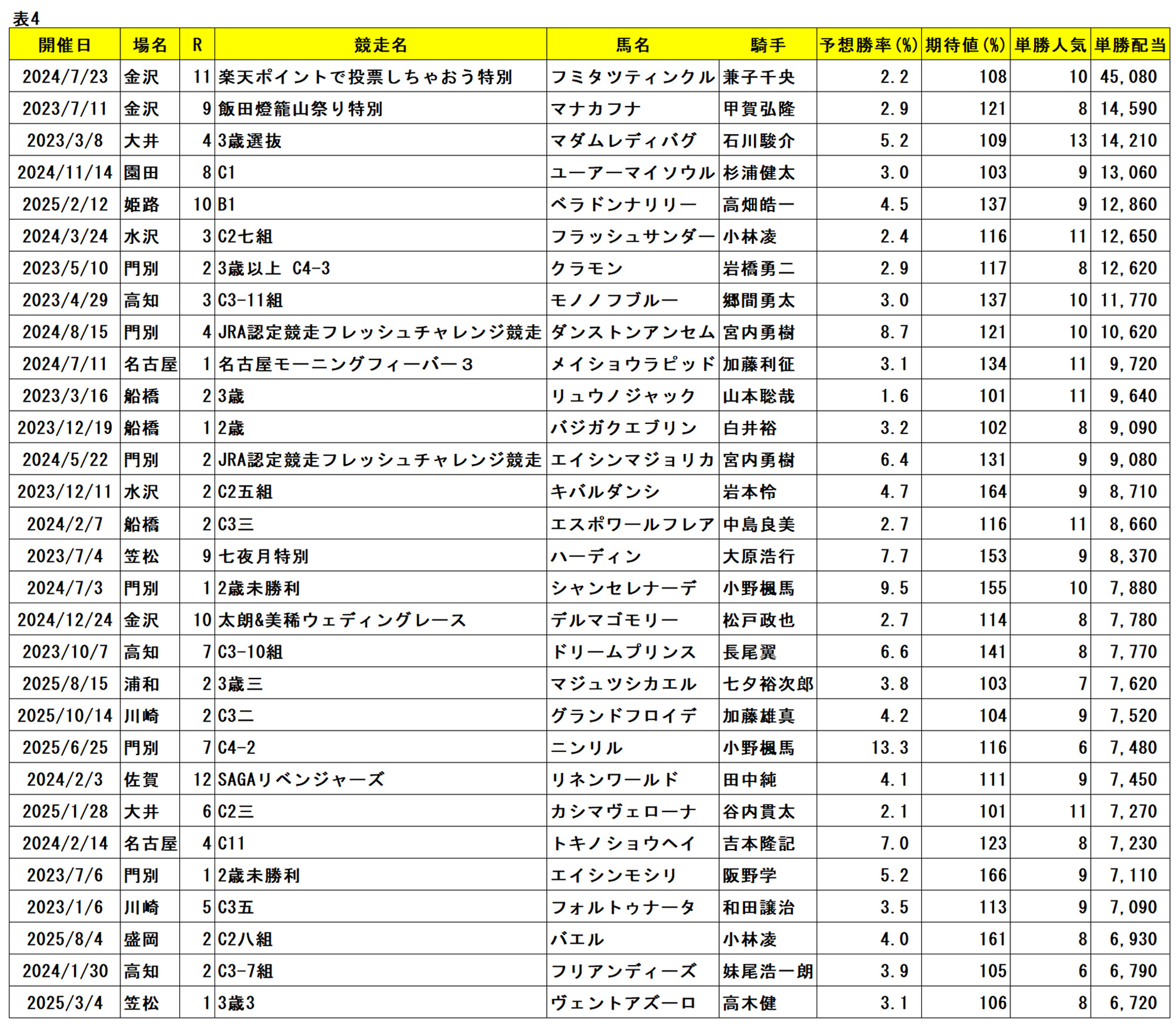 表4は、Expected指数で期待回収率100%以上と判定された馬のうち、実際に的中したレースの単勝配当上位30傑です。